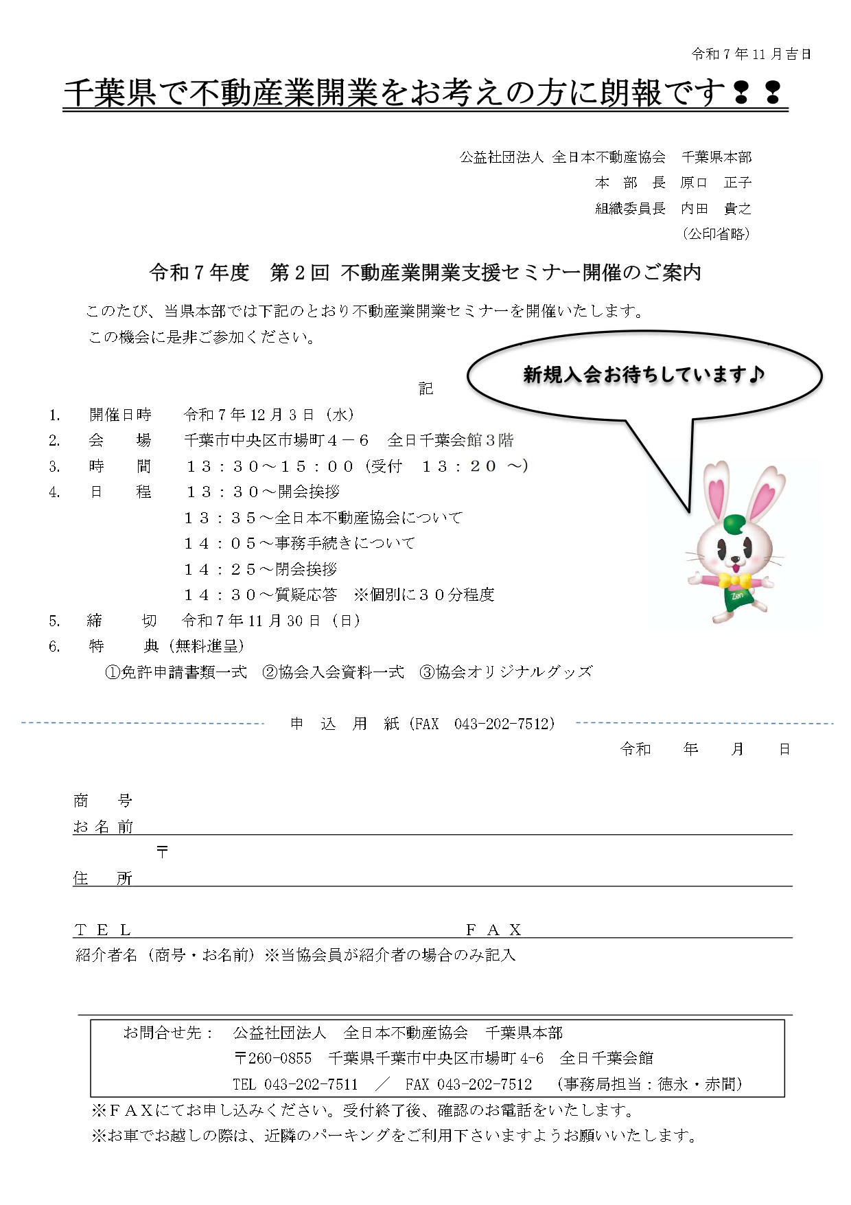 このたび、当県本部では下記のとおり不動産開業セミナーを開催いたします。