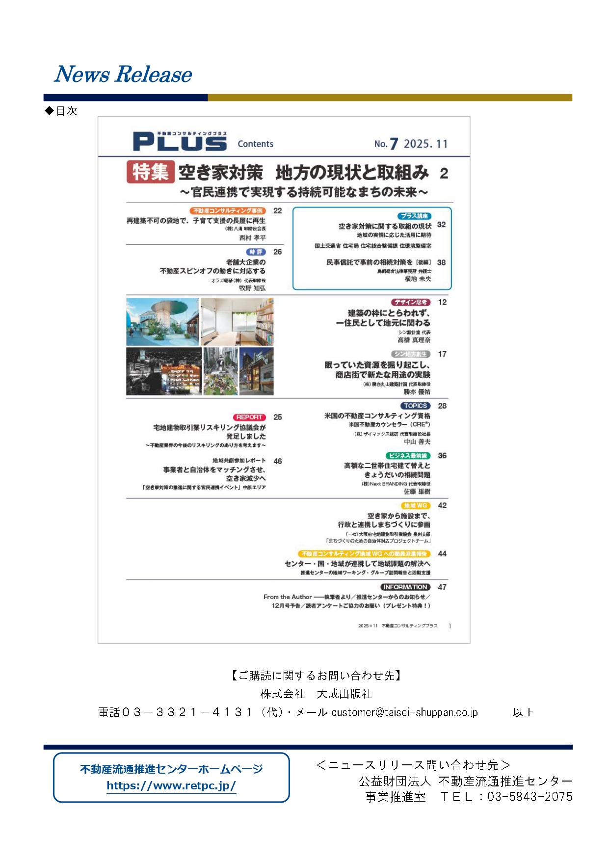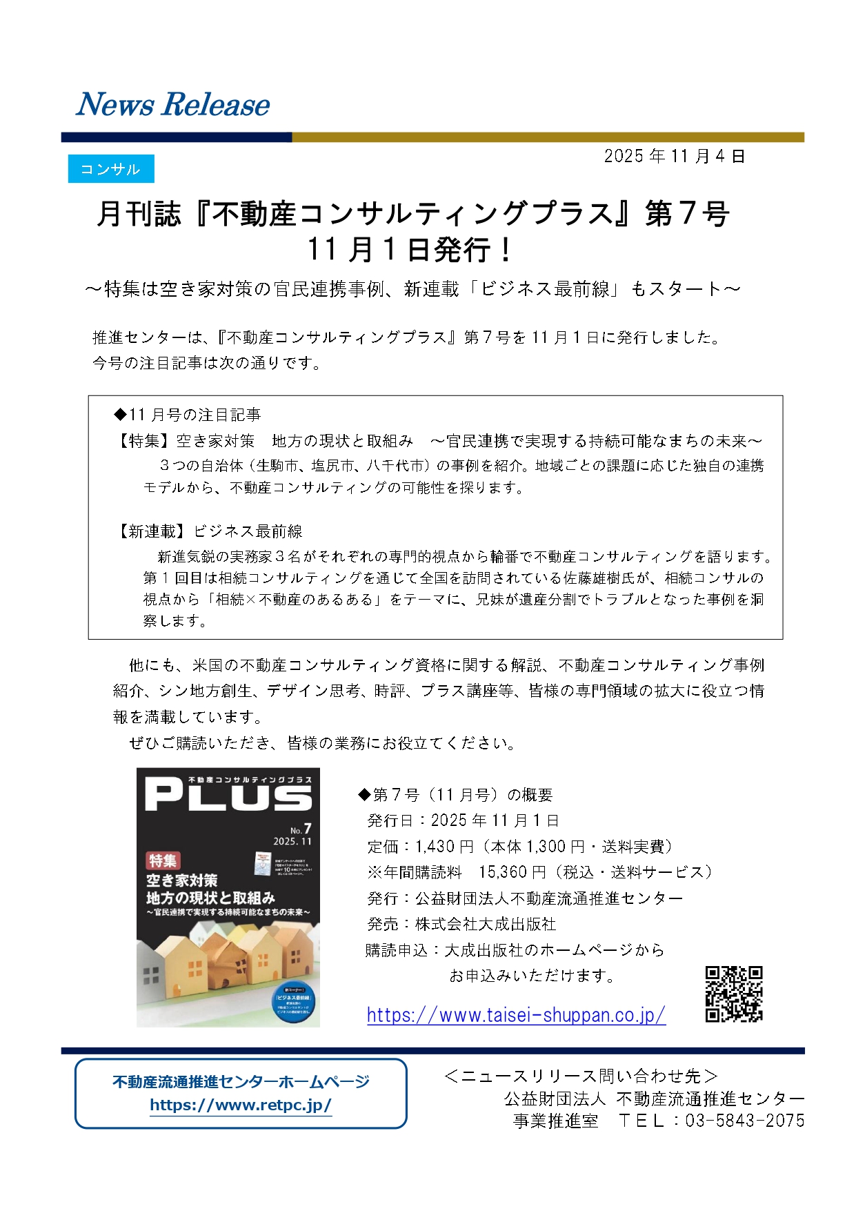 不動産流通推進センターからのお知らせ 月刊誌『不動産コンサルティングプラス』第7号 11 月1日発行! 2025.11.04 不動産流通推進センターは、『不動産コンサルティングプラス』第7号を 11 月1日に発行しました。 PDFダウンロードはこちら👉「不動産コンサルティングプラス」第7号、11月1日発行! 千葉県環境生活部水質保全課からのお知らせ