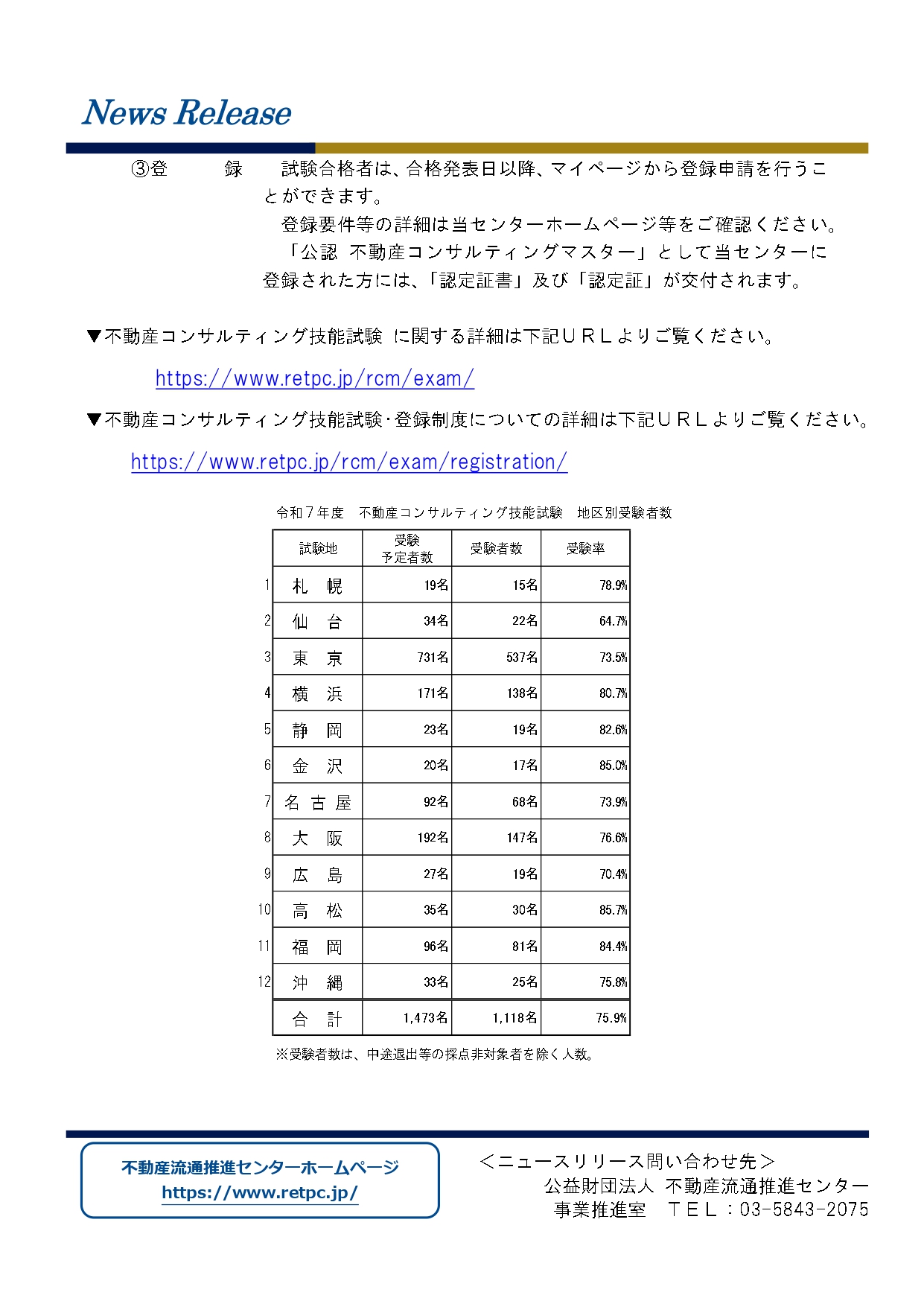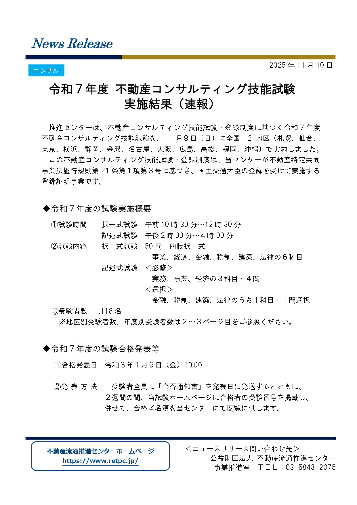 不動産流通推進センターからのお知らせ 令和7年度 不動産コンサルティング技能試験 実施結果