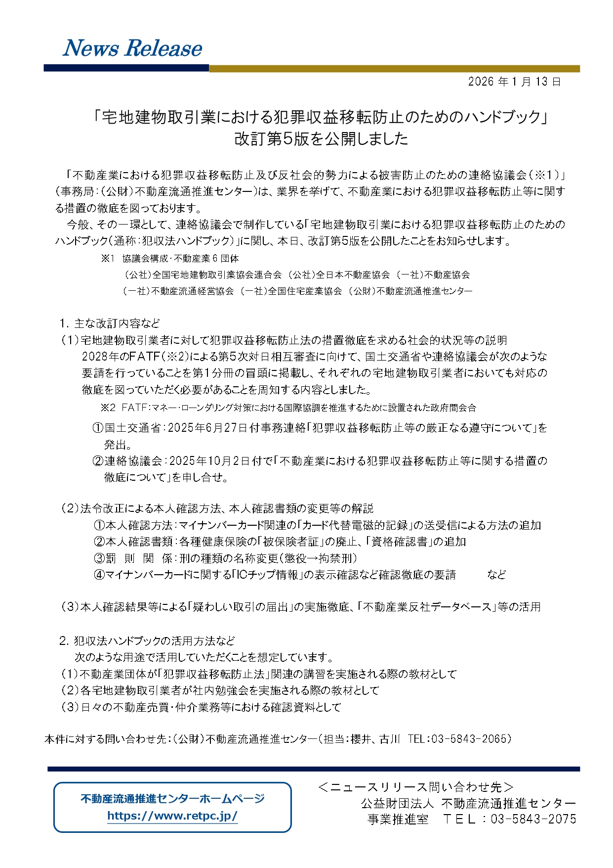 不動産流通推進センターは、「宅地建物取引業における犯罪収益移転防止のためのハンドブック(通称:犯収法ハンドブック)」に関し、本日、改訂第5版を公開したことをお知らせします。